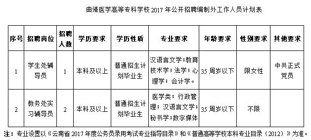 附:曲靖醫(yī)學(xué)高等專科學(xué)校2017年公開招聘編制外工作人員計(jì)劃表