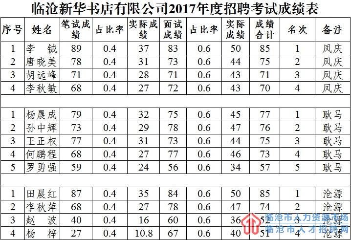 臨滄新華書店有限公司2017年度招聘考試成績公示