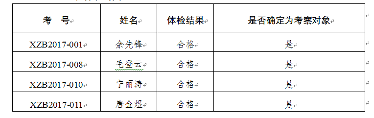 根據(jù)《中共宣威市委辦公室宣威市人民政府辦公室關于印發(fā)宣威市市直機關公開遴選公務員實施辦法(試行)的通知》(宣辦發(fā)〔2017〕114號)規(guī)定,按照規(guī)定的時序安排,本次遴選工作已完成體檢工作?,F(xiàn)將體檢結果及人選考察事項公告如下: