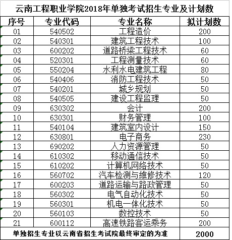 云南工程職業(yè)學院2018年單獨招生章程