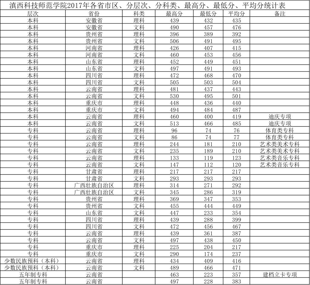 滇西科技師范學(xué)院2017年各省市區(qū)錄取分?jǐn)?shù)統(tǒng)計(jì)表
