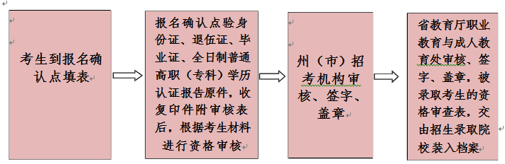 (二)報(bào)名地點(diǎn):應(yīng)屆??飘厴I(yè)考生在畢業(yè)院校報(bào)名確認(rèn)點(diǎn)進(jìn)行報(bào)名;退役士兵考生到戶口所在州(市)招辦指定的院校報(bào)名確認(rèn)點(diǎn)進(jìn)行報(bào)名。