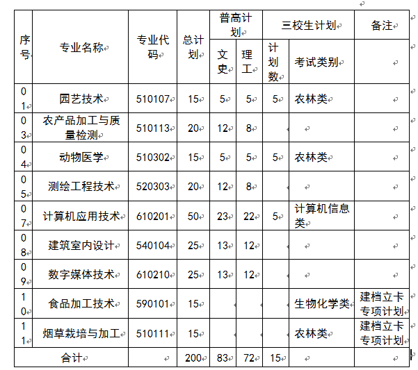 玉溪農(nóng)業(yè)職業(yè)技術(shù)學(xué)院2018年單獨考試招生計劃表