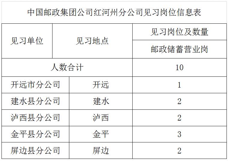 根據(jù)云人社發(fā)[2009]132號關(guān)于印發(fā)《云南省高校畢業(yè)生見習(xí)工作實(shí)施意見的通知》精神,為幫助高校畢業(yè)生通過就業(yè)見習(xí)升華理論知識、增長實(shí)踐技能、提升就業(yè)能力、盡快實(shí)現(xiàn)就業(yè),中國郵政集團(tuán)公司紅河州分公司現(xiàn)面向社會提供10個見習(xí)崗位,現(xiàn)將見習(xí)崗位信息公布如下: