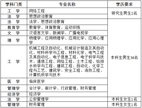 我總隊(duì)接收普通高等學(xué)校2018年應(yīng)屆畢業(yè)生40名。其中,男生38名,女生2名,具體接收專業(yè)及人數(shù)如下: