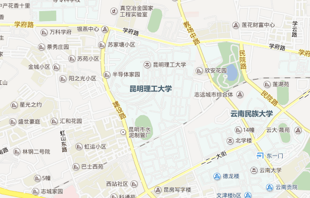 5.自駕車到達(dá)呈貢校區(qū)。市區(qū)沿彩云路直行,或者昆玉高速“三岔口”下,從三鋁公路轉(zhuǎn)入彩云路,彩云南路左轉(zhuǎn)進(jìn)入景明南路。學(xué)校正門位于景明南路,側(cè)門位于聚賢街。