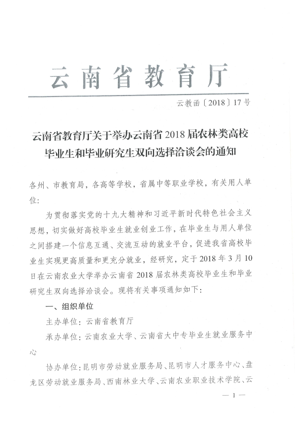 下載附件:云教函〔2018〕17號_云南省教育廳關(guān)于舉辦云南省2018屆農(nóng)林類高校畢業(yè)生和畢業(yè)研究生雙向選擇洽談會的通知_附件.doc