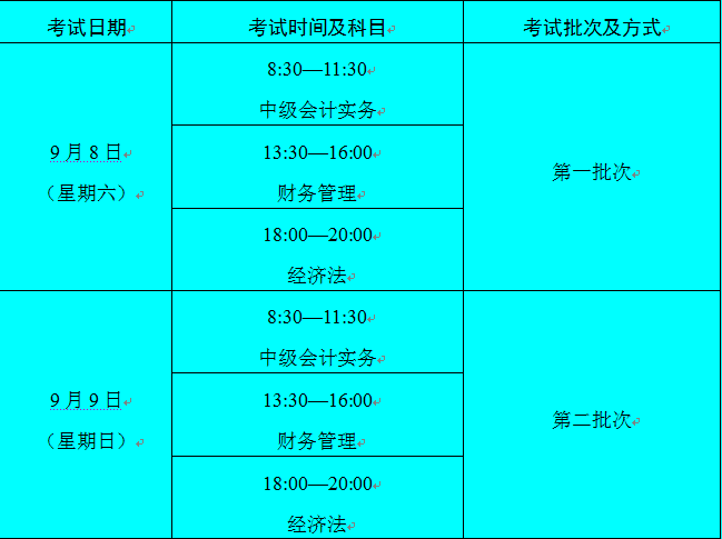 中級資格無紙化考試于2018年9月8日——2018年9月9日舉行,共2個批次。《財務管理》科目考試時長為2.5小時、《經(jīng)濟法》科目考試時長為2小時、《中級會計實務》科目考試時長為3小時。具體考試時間如下: