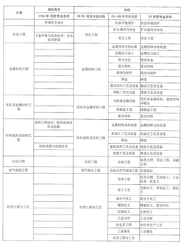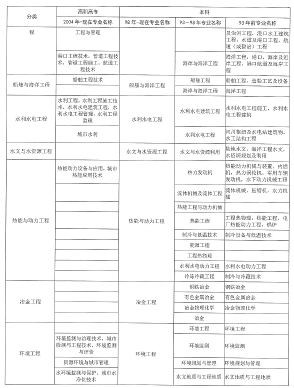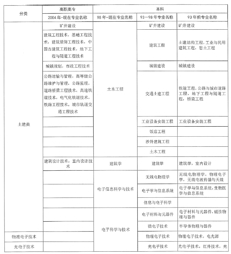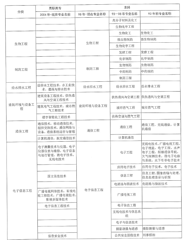 “工程類或工程經濟類專業(yè)”對照表