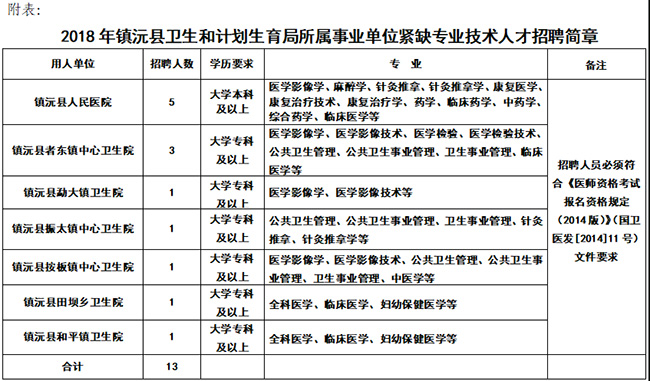 根據(jù)《事業(yè)單位公開招聘工作人員暫行規(guī)定》《普洱市人力資源和社會保障局關(guān)于進一步規(guī)范事業(yè)單位公開招聘工作的通知》的有關(guān)規(guī)定,遵循“民主、公開、競爭、擇優(yōu)”的原則,經(jīng)批準同意,2018年鎮(zhèn)沅縣衛(wèi)生和計劃生育局所屬事業(yè)單位緊缺人才招聘13名(具體條件詳見附表),現(xiàn)將有關(guān)事項公告如下: