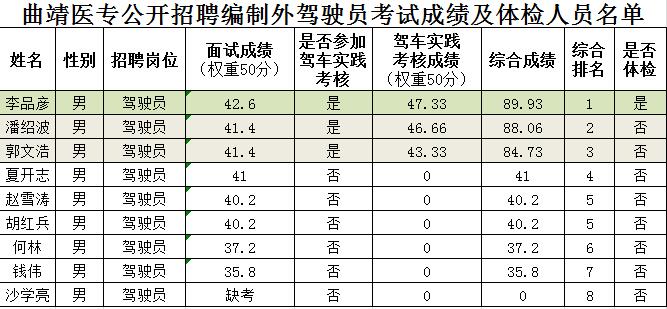 2018年曲靖醫(yī)學(xué)高等??茖W(xué)校公開招聘編制外駕駛員考試成績公告