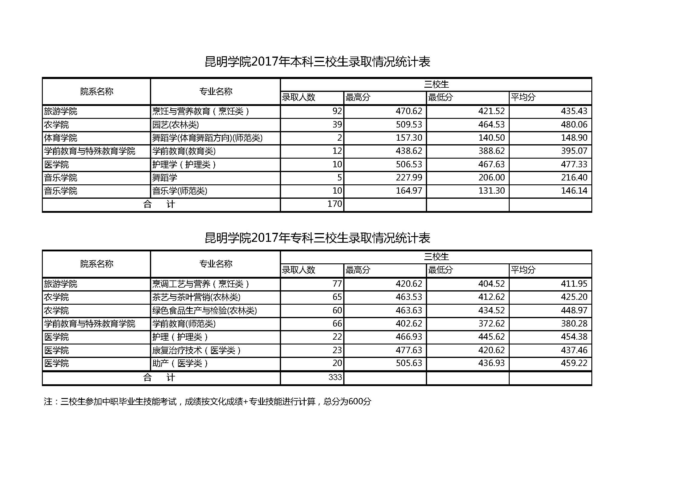 昆明學(xué)院2017年三校生錄取情況統(tǒng)計表