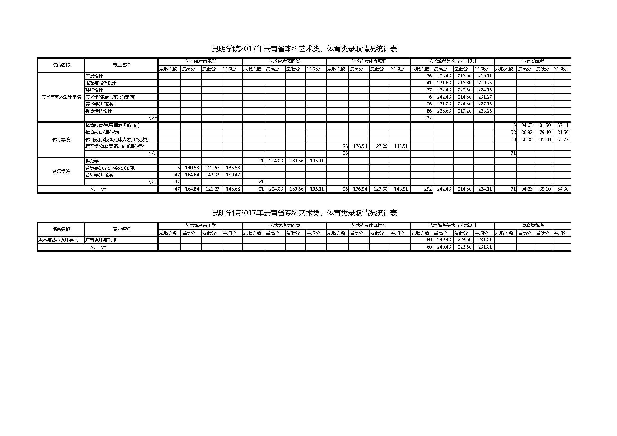 昆明學(xué)院2017年云南省藝術(shù)類、體育類錄取情況統(tǒng)計(jì)表