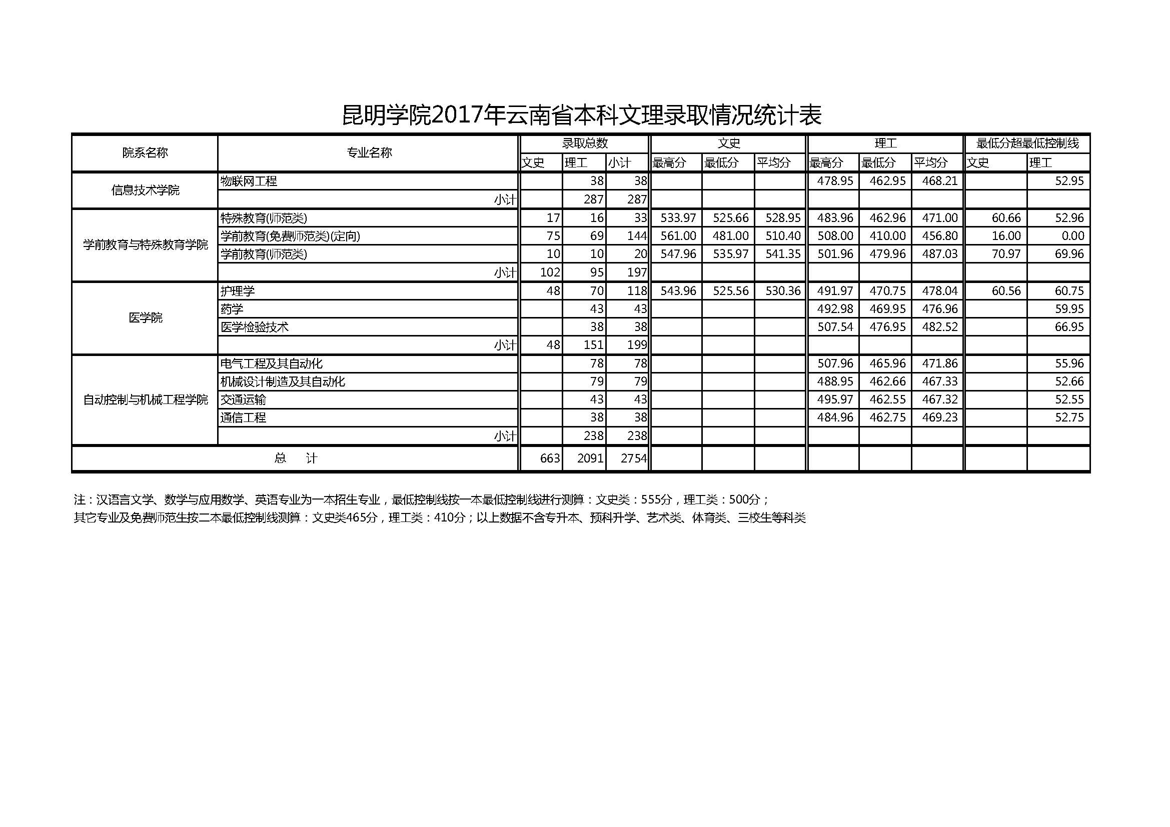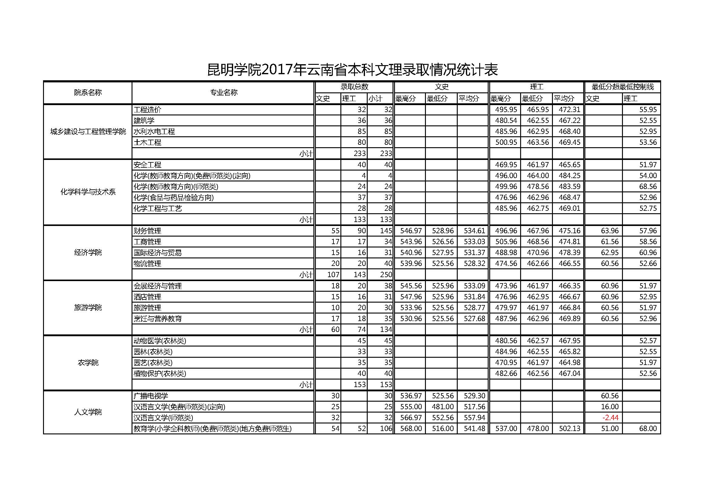 昆明學院2017年云南省本科文理錄取情況統(tǒng)計表