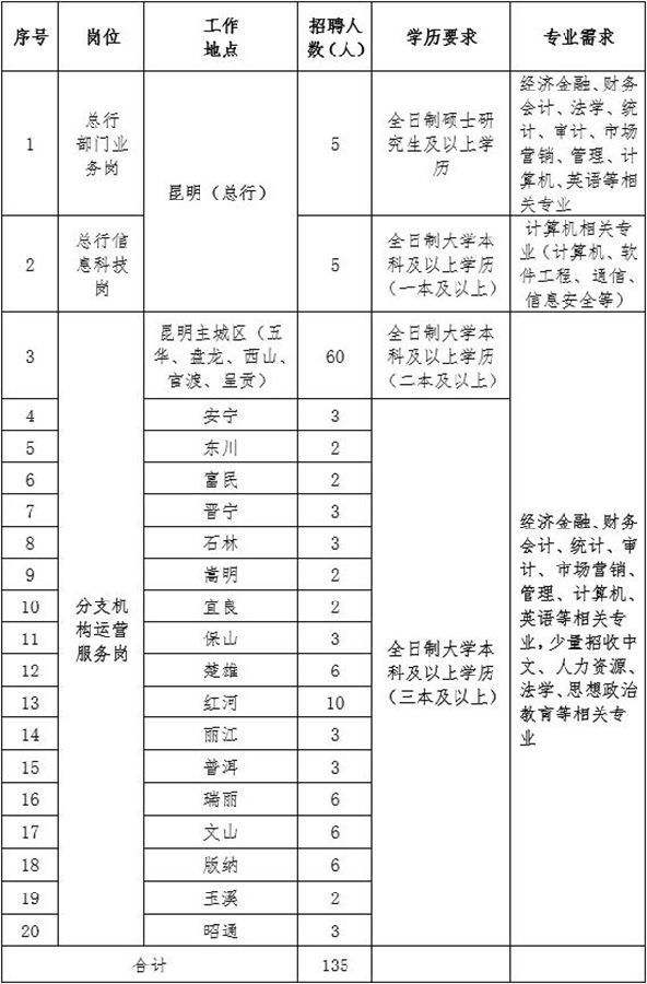 注:1.每人限報(bào)一個(gè)工作崗位;2.州市機(jī)構(gòu)崗位含當(dāng)?shù)亟伎h網(wǎng)點(diǎn)。3.為幫助應(yīng)屆畢業(yè)生更快熟悉掌握富滇銀行業(yè)務(wù)、產(chǎn)品和流程,原則上我們將安排錄用至總行部門業(yè)務(wù)崗、信息科技崗的應(yīng)屆畢業(yè)生到分支機(jī)構(gòu)鍛煉,鍛煉期滿(總行部門業(yè)務(wù)崗2年、信息科技崗3-6個(gè)月),考核合格后安排到總行相關(guān)部門工作。
