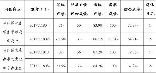 昭陽(yáng)區(qū)2017年公務(wù)員調(diào)任筆試、經(jīng)歷業(yè)績(jī)?cè)u(píng)價(jià)、面試和考察工作已經(jīng)結(jié)束,現(xiàn)將各崗位報(bào)考人員的綜合成績(jī)公告如下: