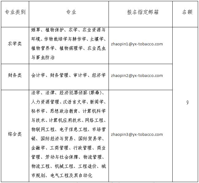 1.全部采取網(wǎng)絡(luò)報(bào)名的方式。應(yīng)聘人員請(qǐng)按要求填報(bào)《云南省煙草公司玉溪市公司應(yīng)聘報(bào)名表》(電子版)、《云南省煙草公司玉溪市公司招聘明示承諾書(shū)》(簽字后的掃描件)、《學(xué)籍證明》(簽字蓋章后的掃描件)以附件形式發(fā)郵件至指定郵箱。每名考生限報(bào)1個(gè)專(zhuān)業(yè)大類(lèi)。