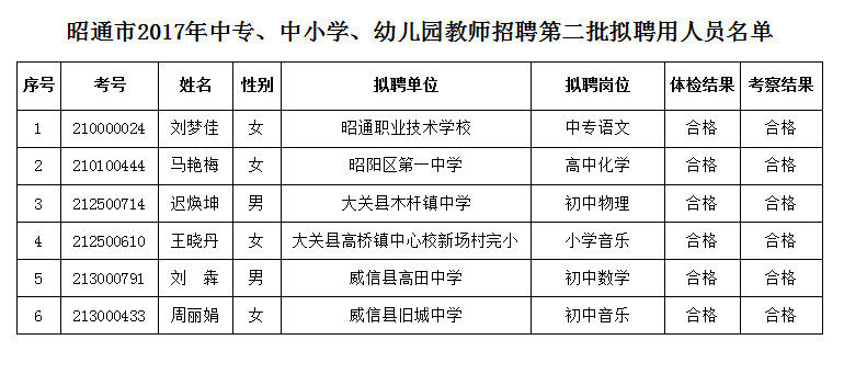 附件:昭通市2017年中專、中小學(xué)、幼兒園教師招聘第二批擬聘用人員名單