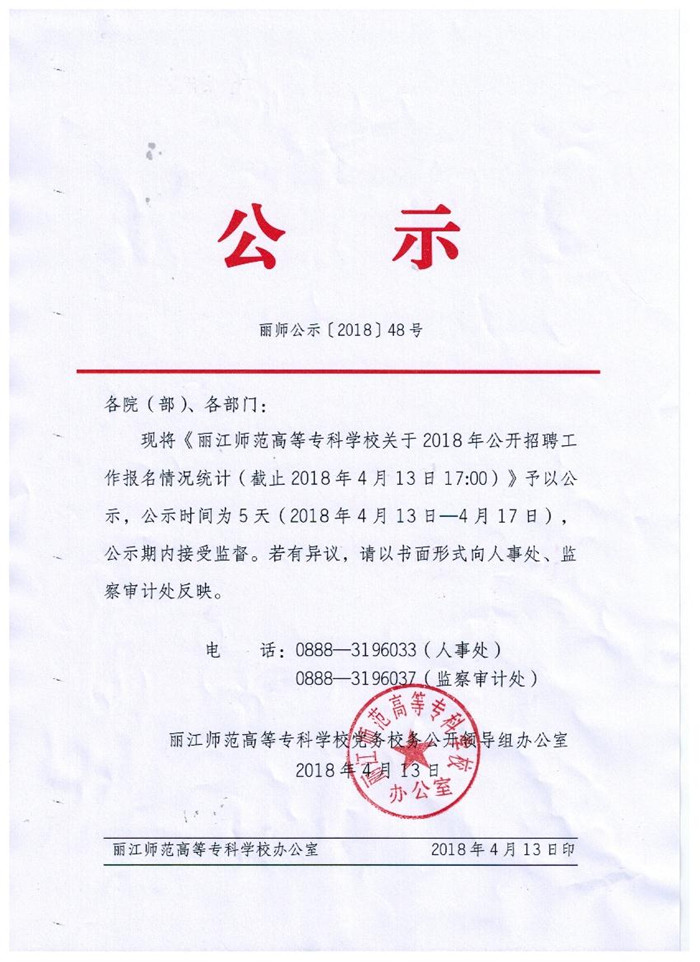 2018年麗江師范高等??茖W(xué)校公開招聘工作報(bào)名情況統(tǒng)計(jì)公示