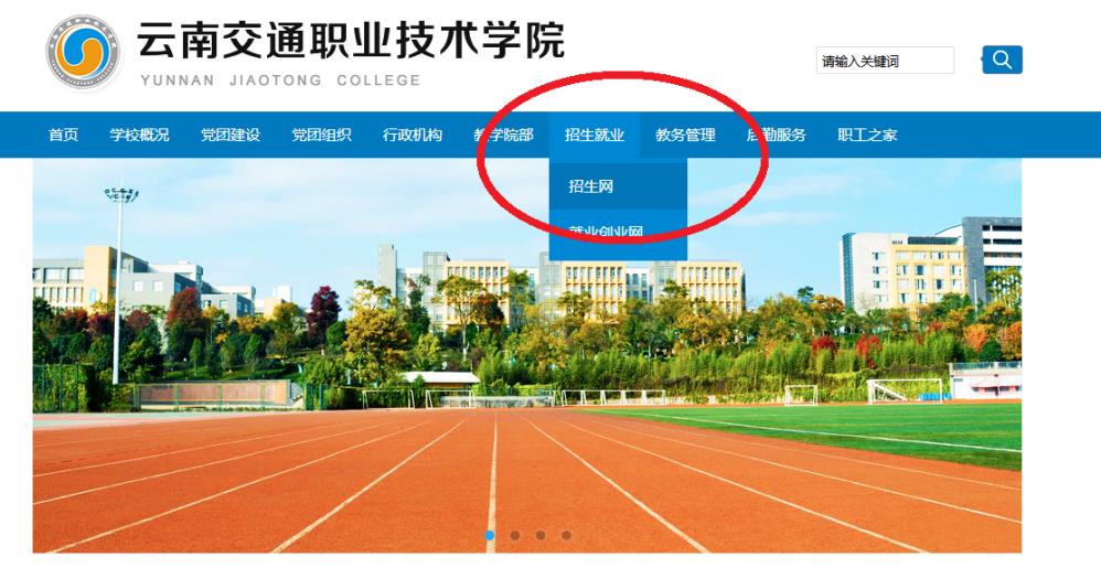 1、在電腦端輸入網(wǎng)址www.ynjtc.com,進(jìn)入云南交通職業(yè)技術(shù)學(xué)院官方網(wǎng)站,點(diǎn)擊“招生就業(yè)”欄目下的“招生網(wǎng)”。