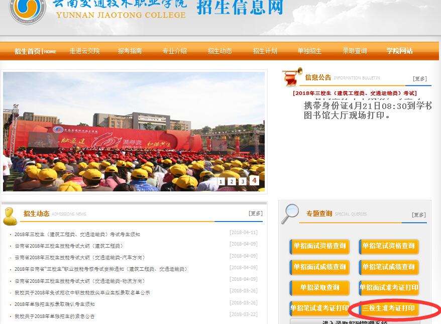 2、進(jìn)入招生網(wǎng)后,在網(wǎng)頁(yè)右下側(cè)找到“三校生準(zhǔn)考證打印”欄目。