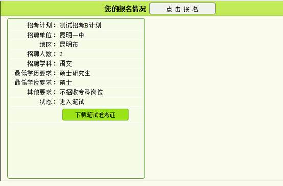9、審核通過(guò)之后, “狀態(tài)”會(huì)變?yōu)?ldquo;進(jìn)入筆試”,就可以下載打印準(zhǔn)考證。