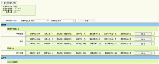 6、同意招考協(xié)議書(shū)之后,可以看到相關(guān)的招考崗位,考生可以自行篩選合適的單位區(qū)域和學(xué)科,對(duì)中意的崗位如果自身情況滿足最低報(bào)名要求可以直接點(diǎn)擊進(jìn)行報(bào)名。