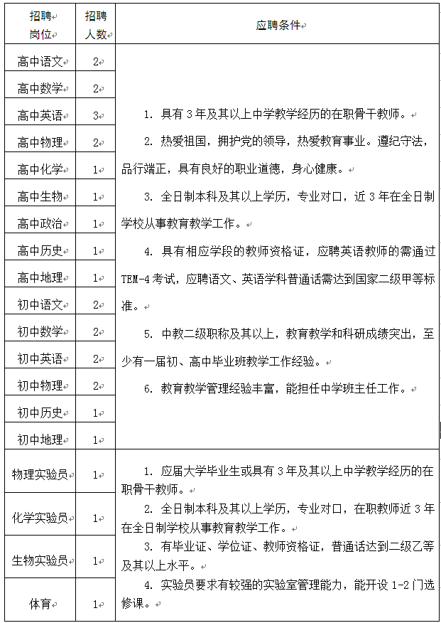 注:男教師年齡在40歲以下,女教師年齡在35歲以下(體育教師年齡在30歲以下)。滿足以下條件之一并取得相關證件者,年齡可適當放寬,同等條件下予以優(yōu)先考慮。
