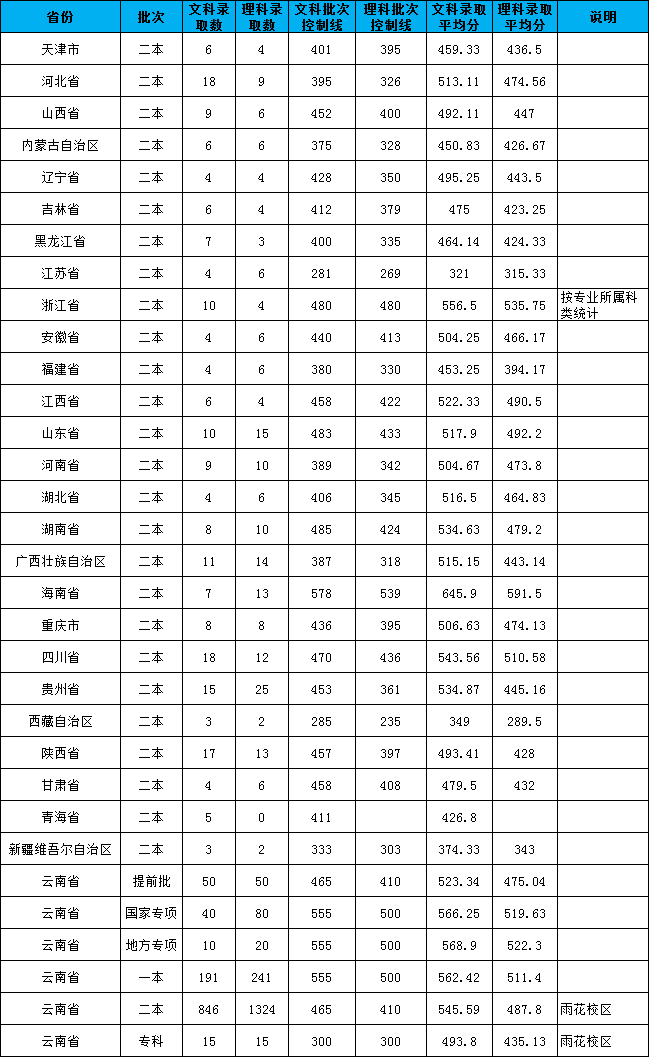 云南民族大學2017年各省份錄取平均分