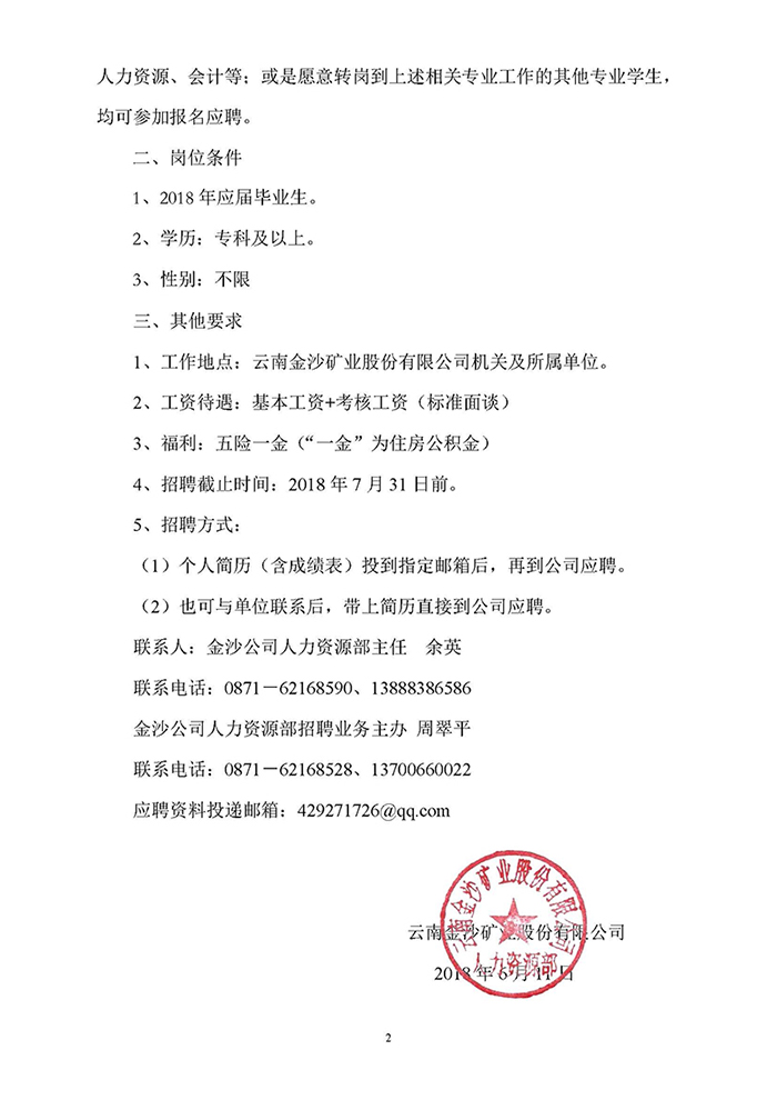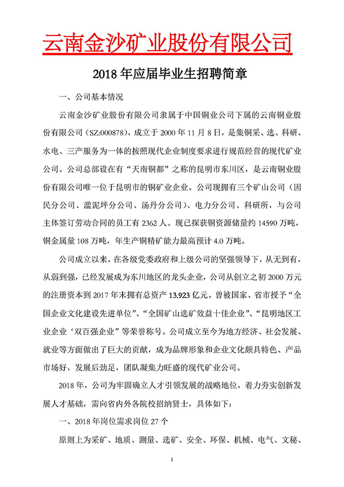 云南金沙礦業(yè)2018年應屆畢業(yè)生招聘簡章