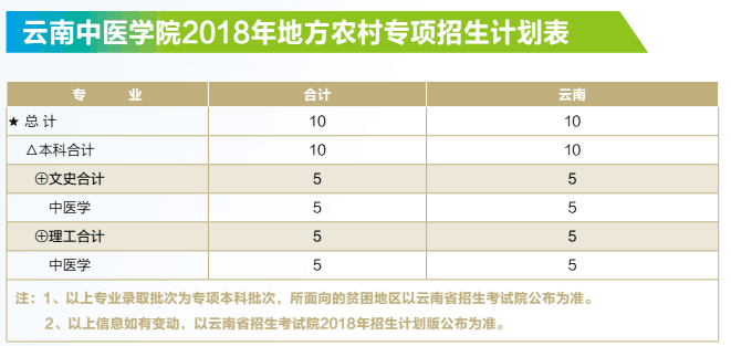 云南中醫(yī)學(xué)院2018年地方農(nóng)村專項(xiàng)招生計劃表