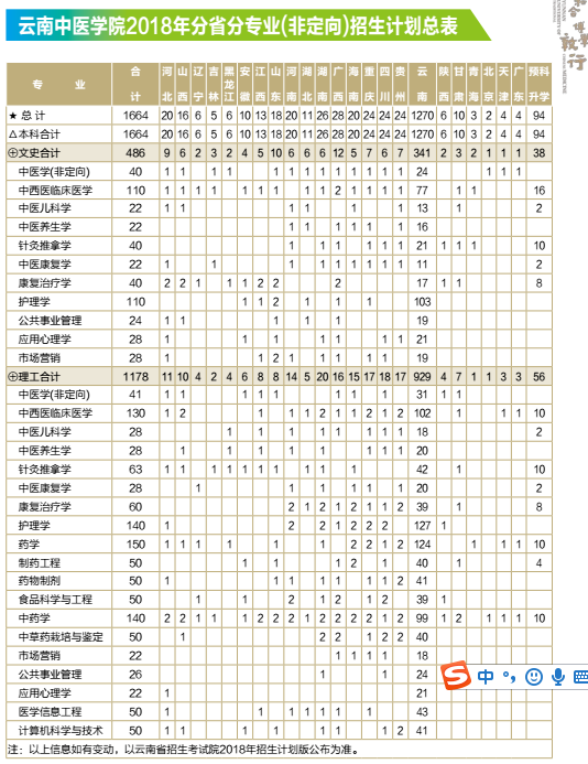 云南中醫(yī)學院2018年分省分專業(yè)(非定向)招生計劃表