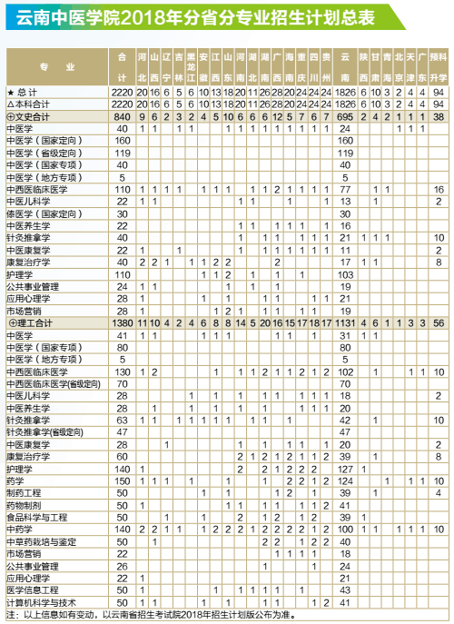 云南中醫(yī)學院2018年分省分專業(yè)招生計劃總表