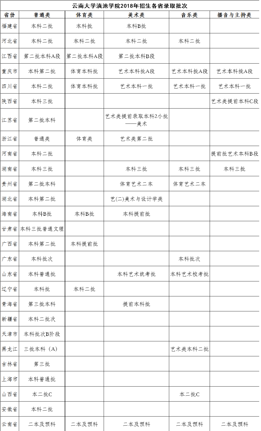 云南大學滇池學院2018年招生各省錄取批次