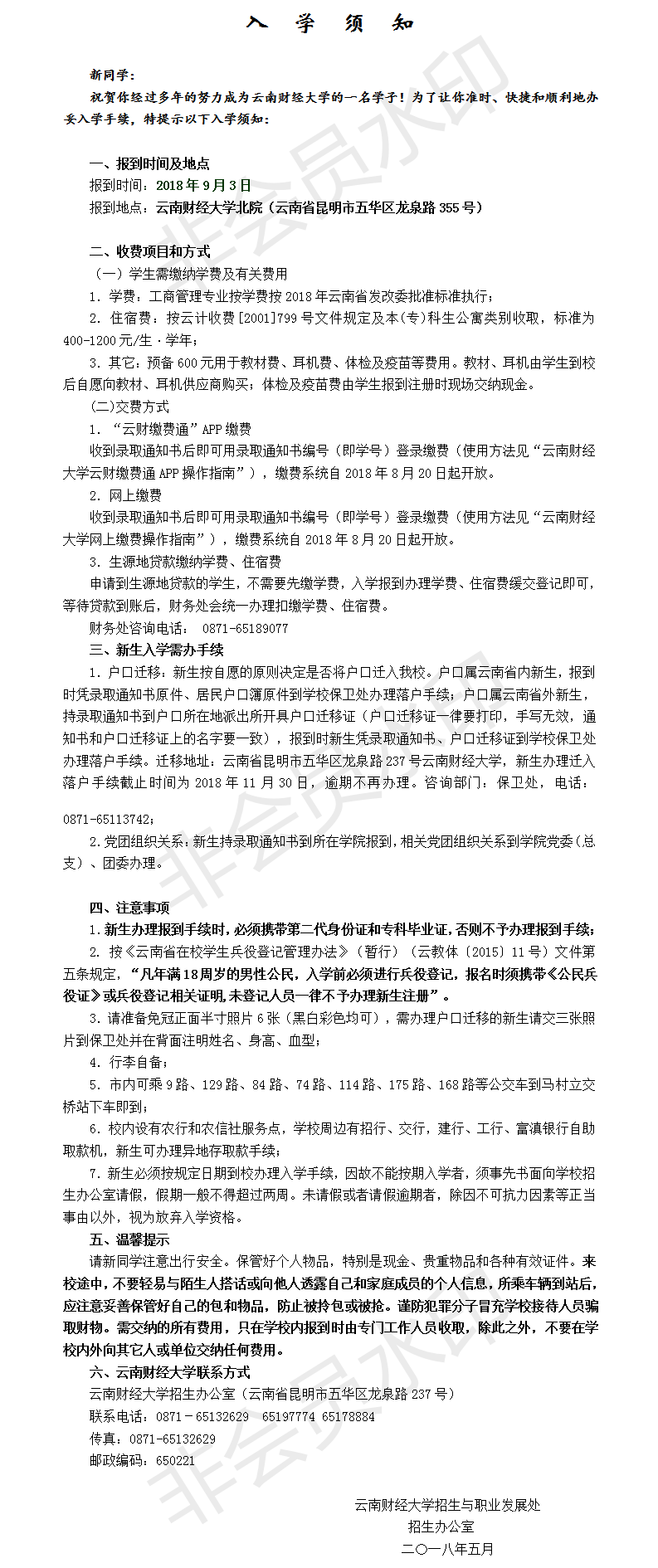 云南財(cái)經(jīng)大學(xué)2018年專(zhuān)升本入學(xué)須知(龍泉校區(qū))
