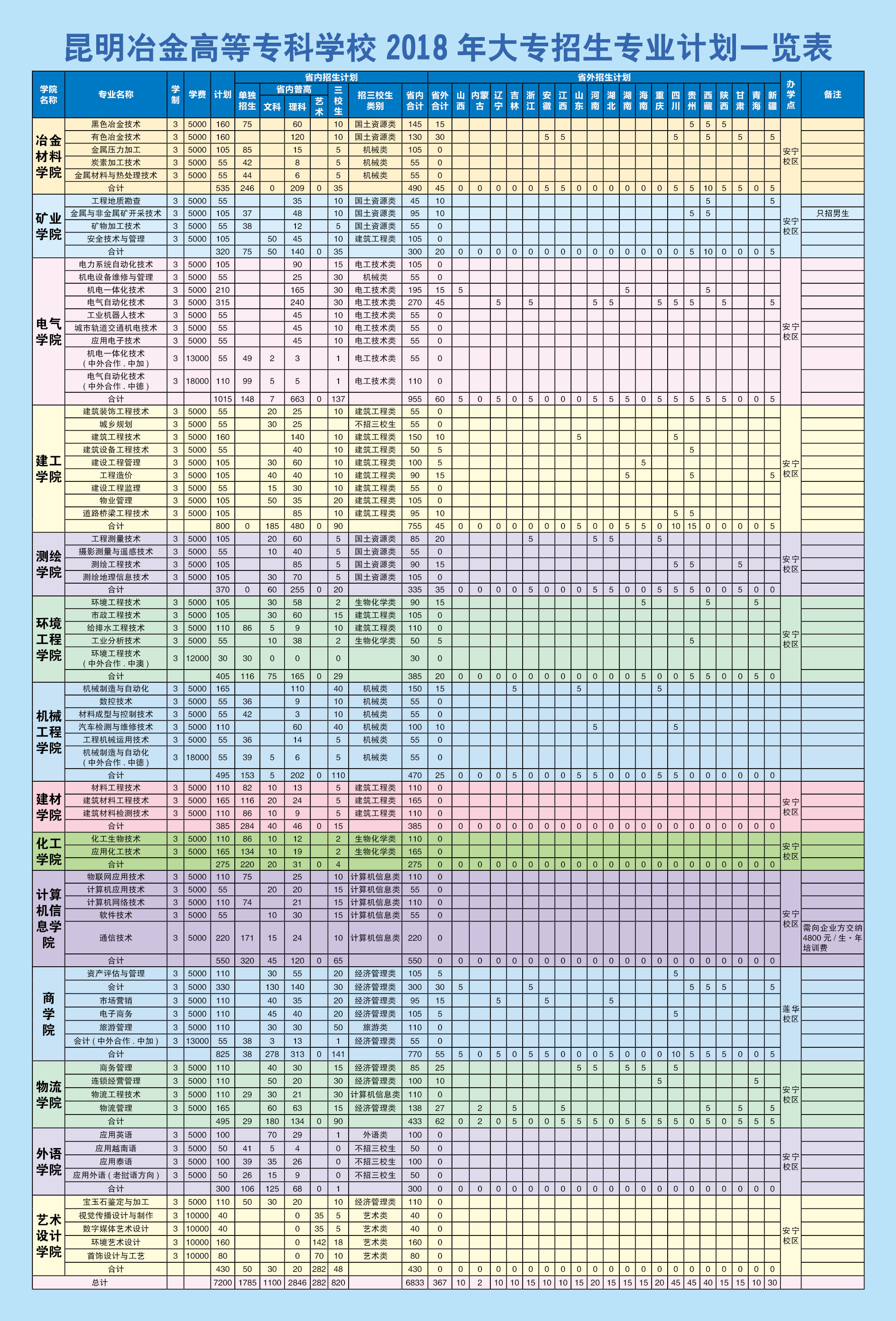 昆明冶金高等專科學(xué)校2018年大專招生專業(yè)計(jì)劃一覽表