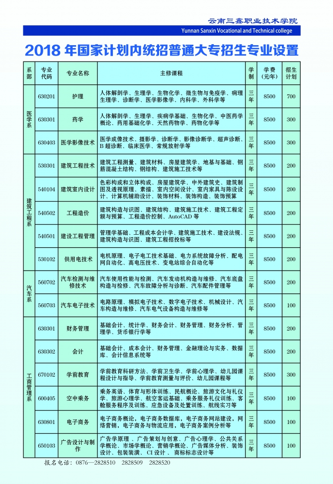 云南三鑫職業(yè)技術學院2018年三年制大專招生專業(yè)設置