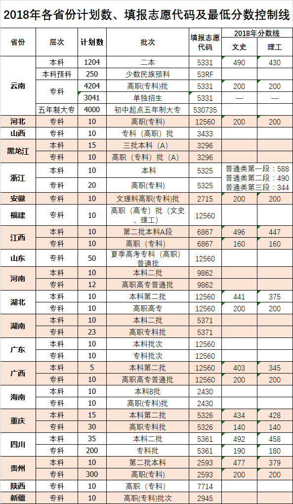 2018年各省份計(jì)劃數(shù)、填報(bào)志愿代碼及最低分?jǐn)?shù)控制線