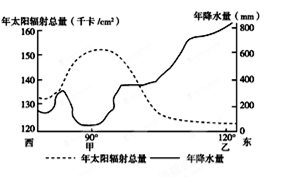 圖2為沿第二亞歐大陸橋中國(guó)段的年降水量和年太陽輻射總量分布圖,讀圖回答第4~5小題。