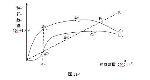(2)圖11中甲、乙兩條曲線分別表示濕地中兩種生物當(dāng)年的種群數(shù)量(Nt)和一年后的種群數(shù)量(Nt+1)中間的關(guān)系,直線P表示Nt+1=Nt。甲曲線上A、B、C三點中,表示種群數(shù)量增長的是 點;乙曲線上D、E、F三點中,表示種群數(shù)量相對穩(wěn)定的是 點;Nt小于a時,甲、乙兩條曲線中 曲線所代表的生物更易消亡。