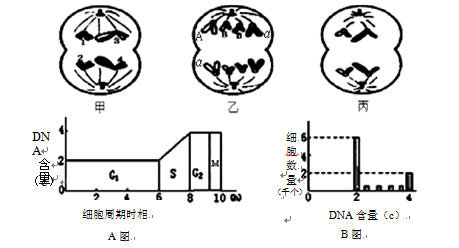 27.如圖8所示,甲、乙、丙是某個二倍體動物的幾個細(xì)胞分裂示意圖(數(shù)字代表染色體,字母代表染色體上帶有的基因),A圖表示一個細(xì)胞周期中的細(xì)胞核內(nèi)DNA含量的變化曲線;B圖表示處于一個細(xì)胞周期中各個時期細(xì)胞數(shù)目變化(用特殊方法在一個培養(yǎng)基中測得的),請據(jù)圖回答(1)~(4)。