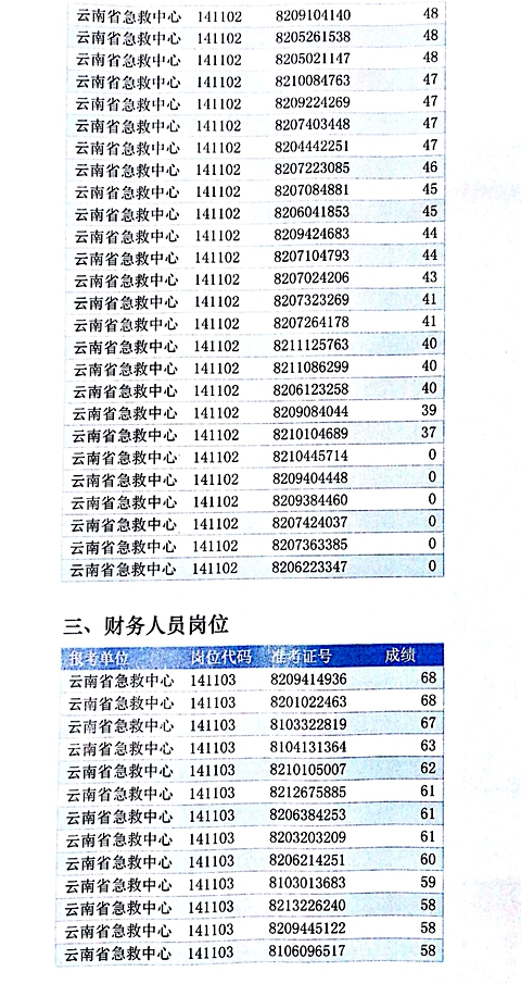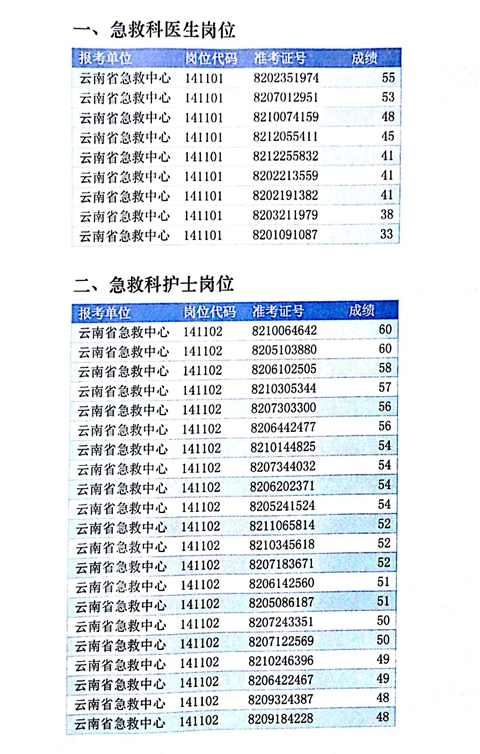 云南省急救中心2018年招聘工作人員(編制內(nèi))考試成績公示