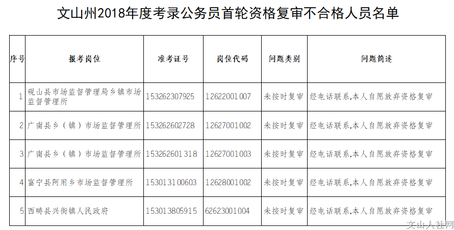 文山州2018年度考錄公務(wù)員資格復(fù)審不合格人員名單