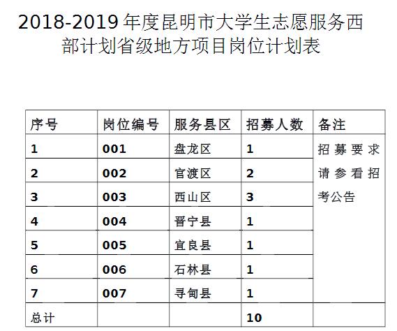 2018-2019年度昆明市大學生志愿服務西部計劃省級地方項目崗位計劃表