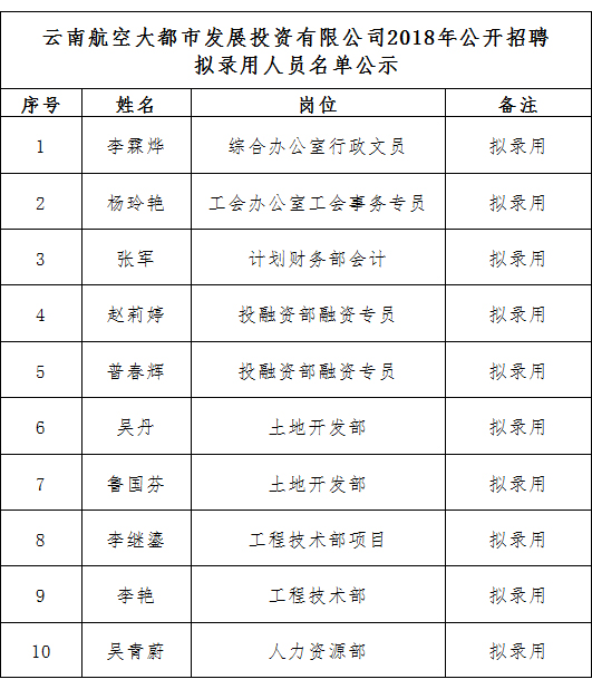 根據應聘人員綜合成績、體檢及資格審查情況等,確定滿足本次招聘錄用條件的擬錄用10人,現將云南航空大都市發(fā)展投資有限公司2018年公開招聘擬錄用人員名單予以公示,公示時間為2018年7月4日至7月6日。請擬錄用人員于2018年7月9日前到崗。公示期內,如對擬錄用人員有異議或有其他問題,請在7月6日下午17:00前向我公司反映,監(jiān)督舉報電話:0871-63337528。