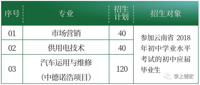 報(bào)讀辦法:填報(bào)中考志愿時(shí)第一志愿填寫“德宏州中等職業(yè)學(xué)校”及相應(yīng)的專業(yè),根據(jù)專業(yè)按中考分?jǐn)?shù)擇優(yōu)錄取。