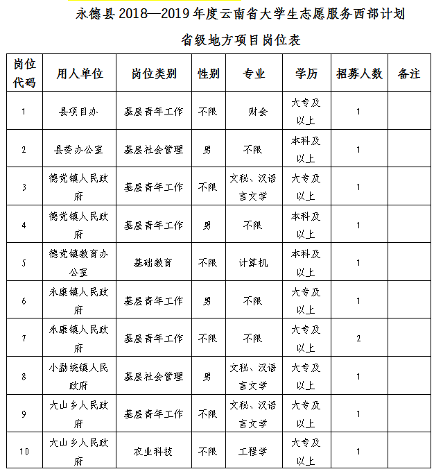 永德縣2018-2019年度云南省大學(xué)生志愿服務(wù)西部計劃省級地方項目志愿者新招募名額為19名。