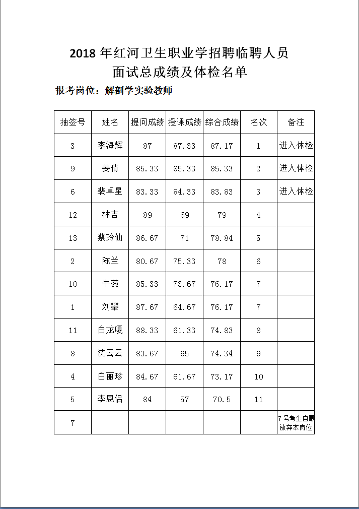 附:2018年紅河衛(wèi)生職業(yè)學(xué)院招聘臨聘人員面試總成績(jī)及體檢名單