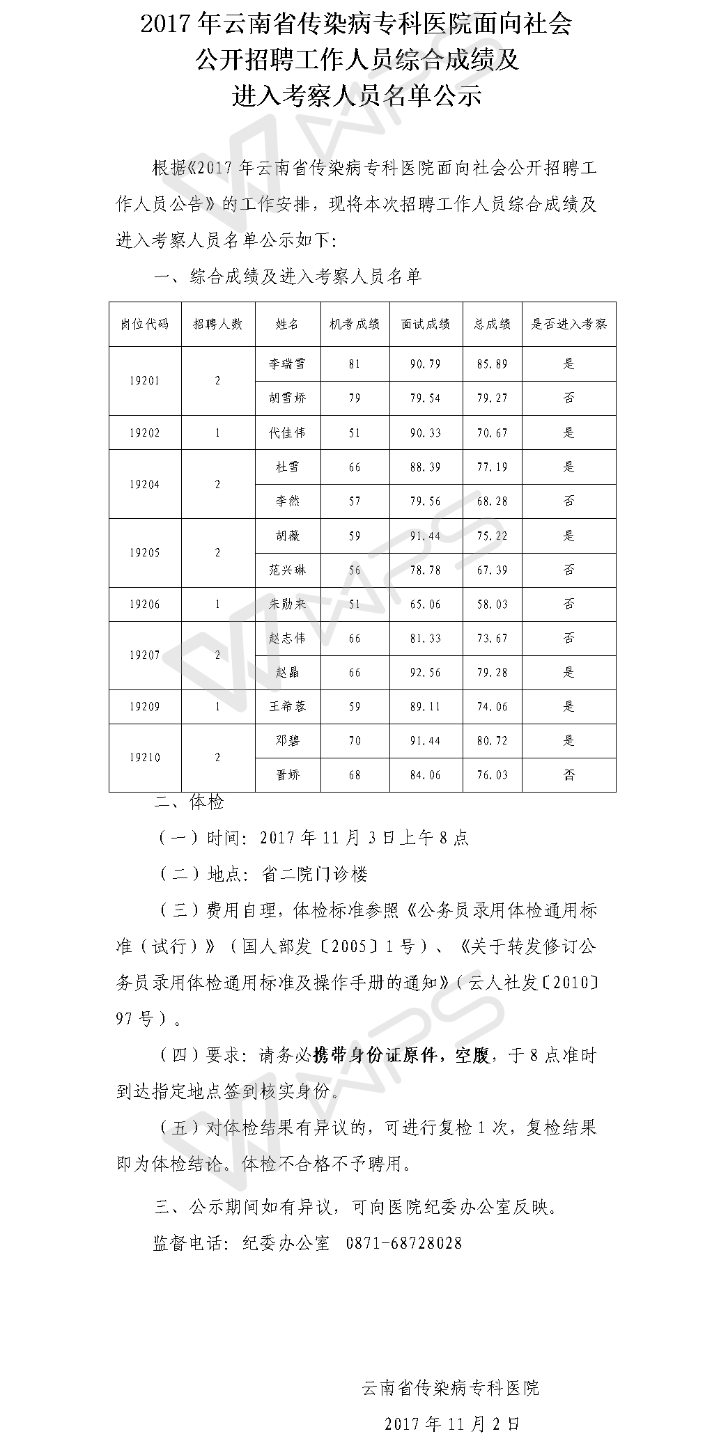 2018年云南省傳染病??漆t(yī)院招聘綜合成績及考察名單公示