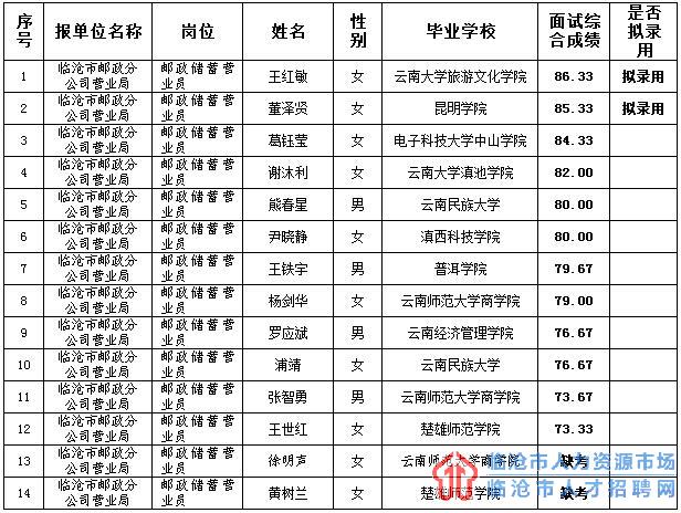 根據(jù)“公平、公正、公開”的原則,中國郵政集團公司臨滄市分公司接收見習人員考試已結(jié)束,經(jīng)紀檢監(jiān)察審定,現(xiàn)將招聘崗位面試綜合成績公告如下: